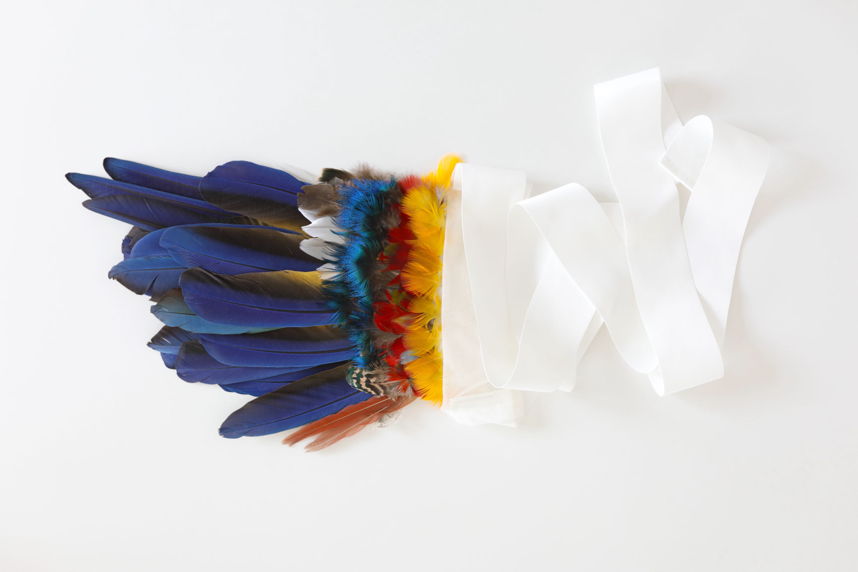 "The wing of the Phoenix", bird feathers, sewn tulle and matte satin fabric.