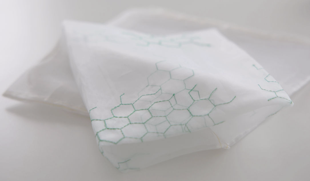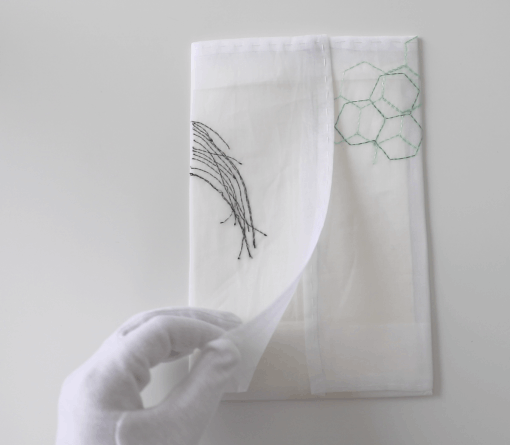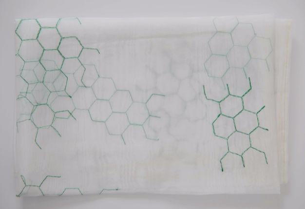 During her six month stay in Morocco, Carolina embroidered veils with green silk thread on white organdy.